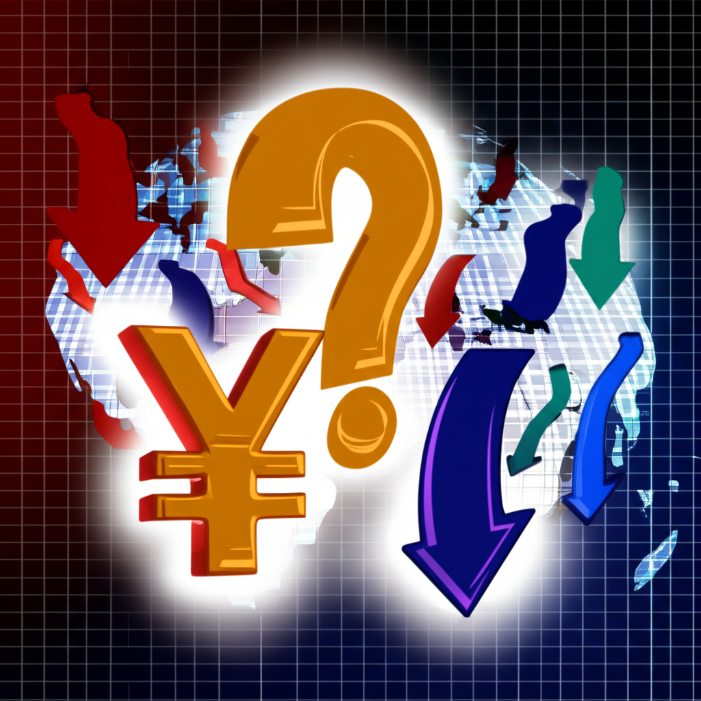 日圓貨幣符號在全球經濟動盪中浮現,上方有問號象徵迷思與現實,伴隨貶值箭頭向下