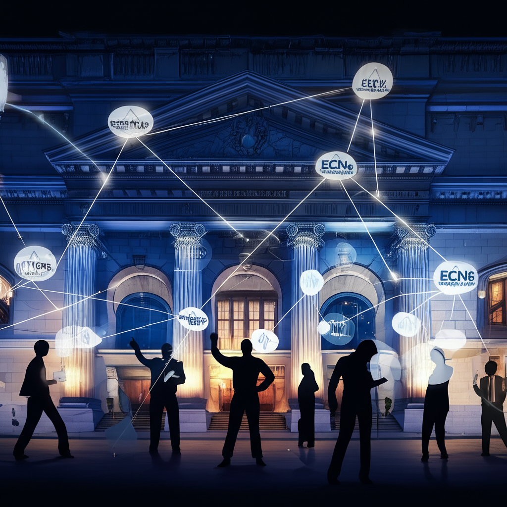 美股夜盤交易本質的圖示,展示夜間股市建築與電子通訊網路連接交易者反應新聞