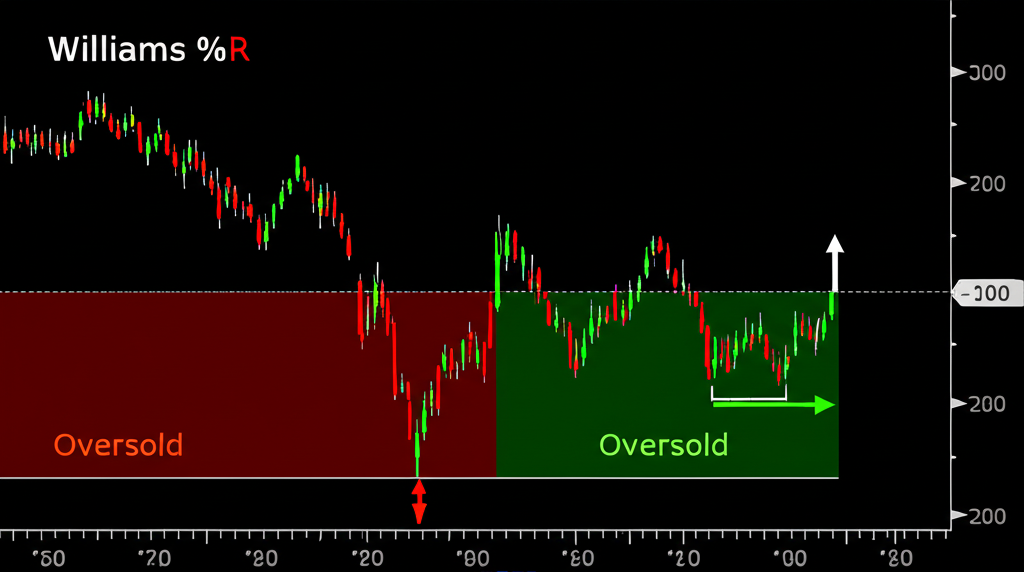 除了基本的 -80 與 -20 穿越訊號,更可靠的策略是尋找「背離」。當股價創新低但指標未跟進(牛市背離),是強力買點;反之,股價創新高但指標高點下移(熊市背離),則是強力賣點。若再結合趨勢方向順勢操作,進場勝率將顯著提升。